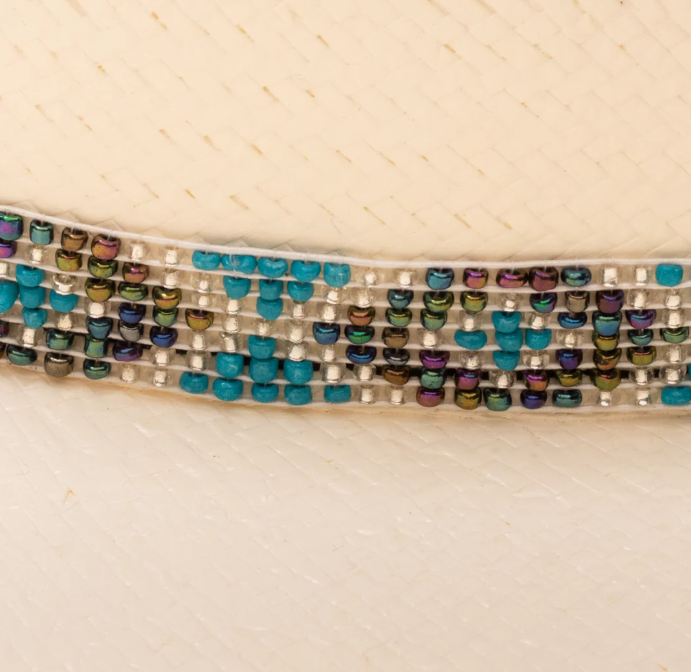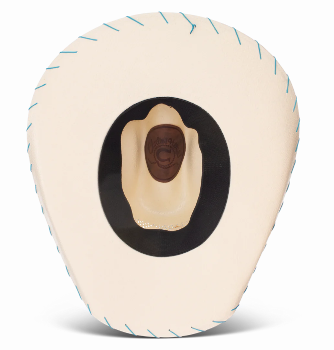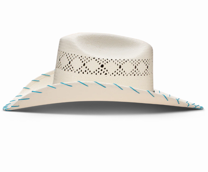 Ya’atah! Part of the Charlie 1 Horse Youth Collection, the Apache Jr. Hat is as much of a free spirit as she is. This shantung straw hat comes in a 4 1/8” cattleman’s crown with a 4” brim. The beaded hatband features a crisp, energizing diamondback pattern. Bright blue whip stitching adds charm and contrast to the brim. Classic vent patterning and a rusty, off-center Charlie 1 Horse brand logo complete the look. A stretchable elastic sweatband helps to ensure that she won’t outgrow it before summer’s end.