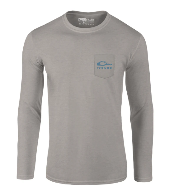 The Drake Long Sleeve Logo Graphic Tee is built with a 60% cotton and 40% polyester blend which supplies softness and comfort. The Drake RWD has the Drake logo on the front pocket and depicts a retro Wood Duck graphic on the back, from our Long Sleeve Graphic Tee Series