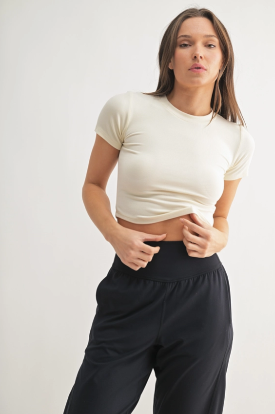 Whether as a workout top (worn over a Mono B sports bra and a pair of Mono B leggings) or as a cute top (matched with a denim item), this cropped tee is as versatile as it is comfortable. It has short sleeves, a rounded neckline, and a form-fitting silhouette.