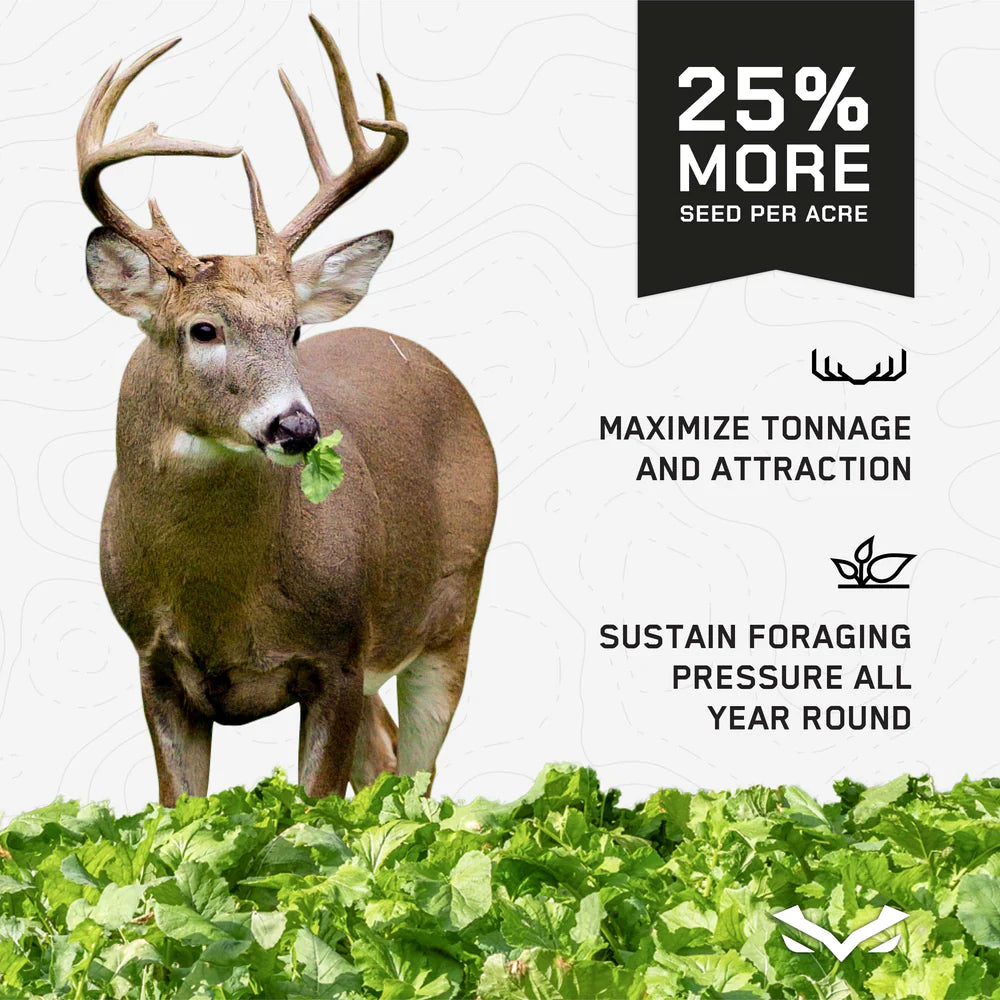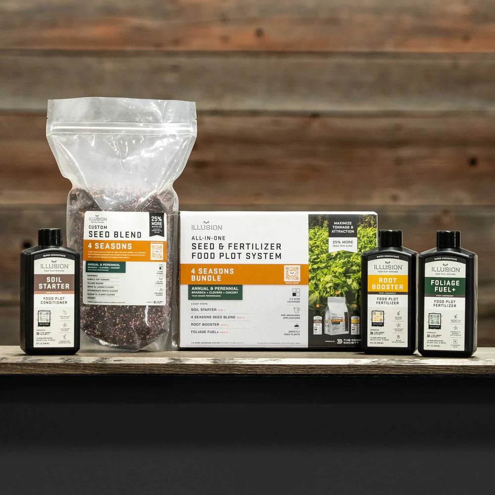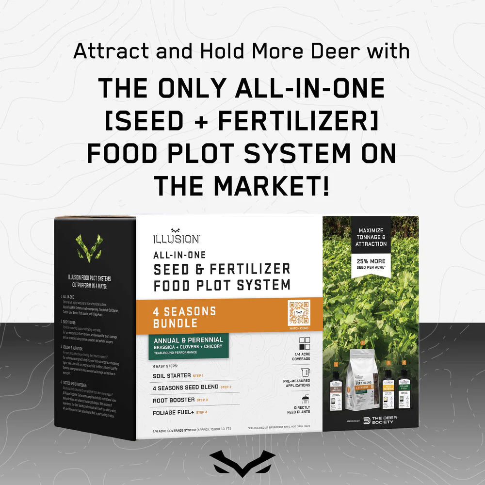 The 4 Seasons food plot system is an ALL-IN-ONE (Seed + Fertilizer) perennial + annual system designed to help maximize the volume and attraction of your food plot. A year-round source of food for deer and other wildlife, our 4 Seasons blend combines perennials and annuals to keep the local herd fed with highly palatable nutrients throughout each season. This custom blend is comprised of three select brassica varieties that are highly attractive to deer during the late fall and winter months along with four perennial varieties that will attract and sustain deer and wildlife during the spring, summer and early fall months.