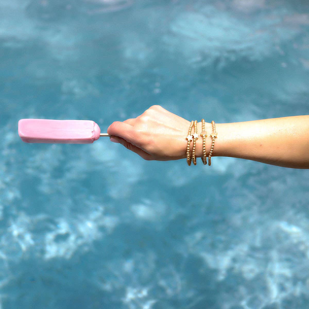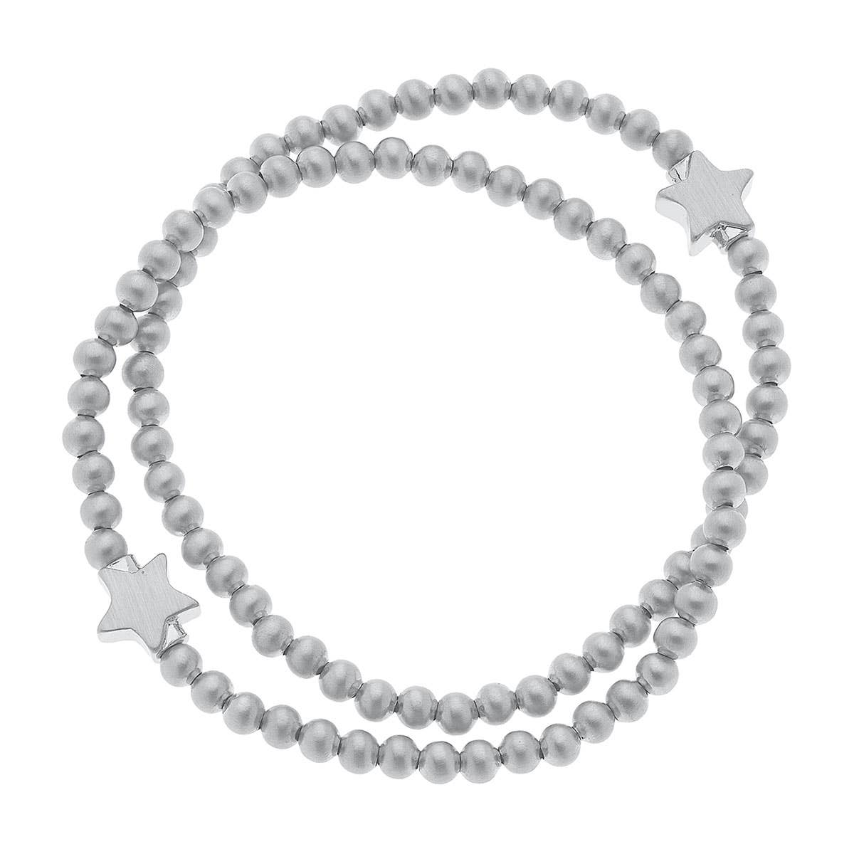 These Isa Star Ball Bead Stretch Bracelets (Set of 2) in Satin Sliver add a touch of elegance to any outfit. The stretch design allows for a comfortable fit and the satin finish gives a subtle shine. Perfect for everyday wear or special occasions.