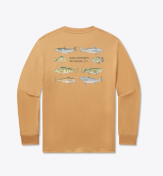 If fishing is life and you're always looking to cast a line, our long sleeve Southern Swimmers Tee is designed for you. This ready to wear, lightweight tee showcases some of the most popular swimmers in full color design on the back. Our comfortable cotton tees have a handy front pocket and come with a printed neck tag for added comfort.