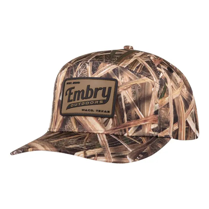 This 6-panel hat isn't like most. The fit is like that of a 7-panel but without the double panel on top. It gives this hat a special look. This features the Shadow Grass Blades Mossy Oak Camo! - 100% polyester material - Embry Outdoors "Curl E" logo snapback tag - Trucker fit