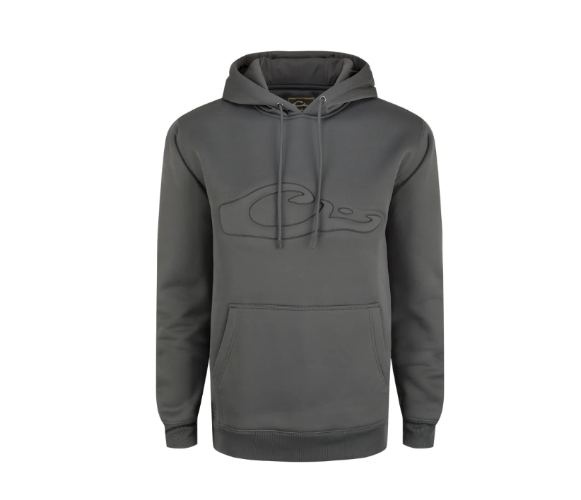 The Drake Back Eddy Embossed Logo Hoodie features 100% polyester with a raised Drake logo, which gives you a stretchy hoodie that keeps its shape. We finished the hoodie with a DWR coating which helps shed a light rain or snow shower. It is a great piece to wear alone, or it can be used as a mid-layer piece for those chilly winter mornings. Complete with a traditional kangaroo pocket to keep your hands warm along with a 3-piece lined hood with adjustable drawstrings for adjustability, the Embossed Logo Hoodie will be part of your wardrobe for years to come.
