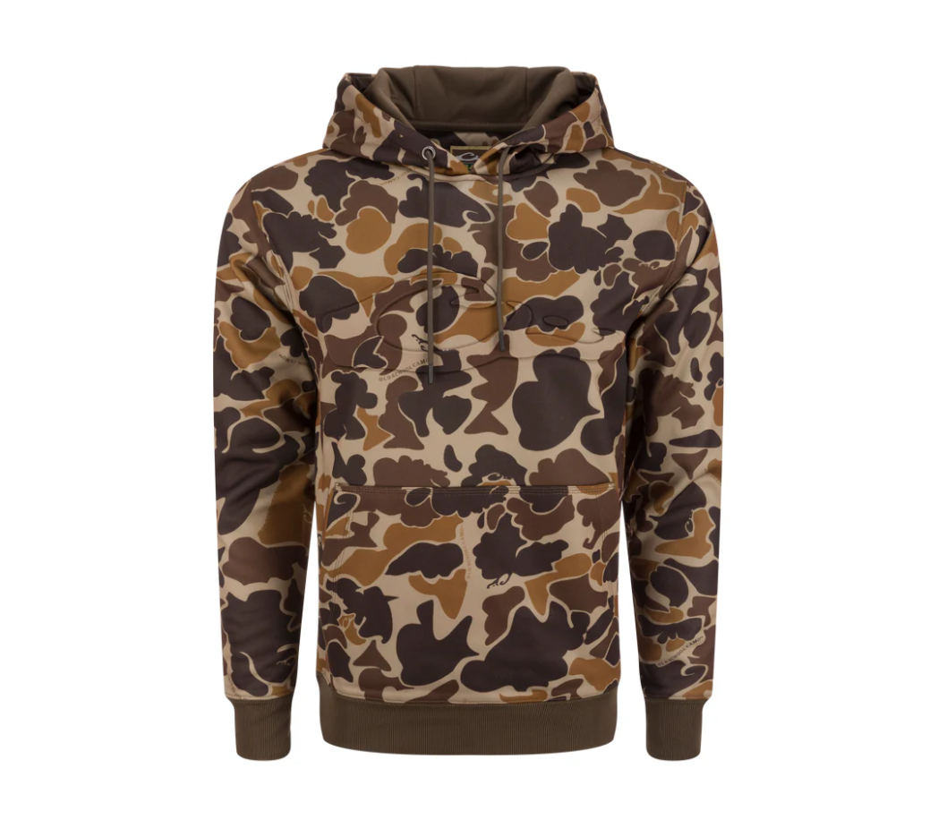 The Drake Back Eddy Embossed Logo Hoodie features 100% polyester with a raised Drake logo, which gives you a stretchy hoodie that keeps its shape. We finished the hoodie with a DWR coating which helps shed a light rain or snow shower. It is a great piece to wear alone, or it can be used as a mid-layer piece for those chilly winter mornings. Complete with a traditional kangaroo pocket to keep your hands warm along with a 3-piece lined hood with adjustable drawstrings for adjustability, the Embossed Logo Hoodie will be part of your wardrobe for years to come.