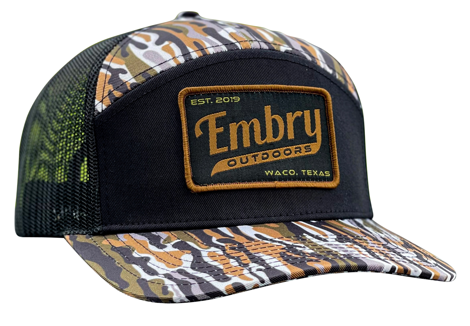 A 7-panel trucker hat that features our brand new "Ranch" camo with our classic "Retro" logo! Brim comes flat, but is made to be very easily bendable to your desired likeness