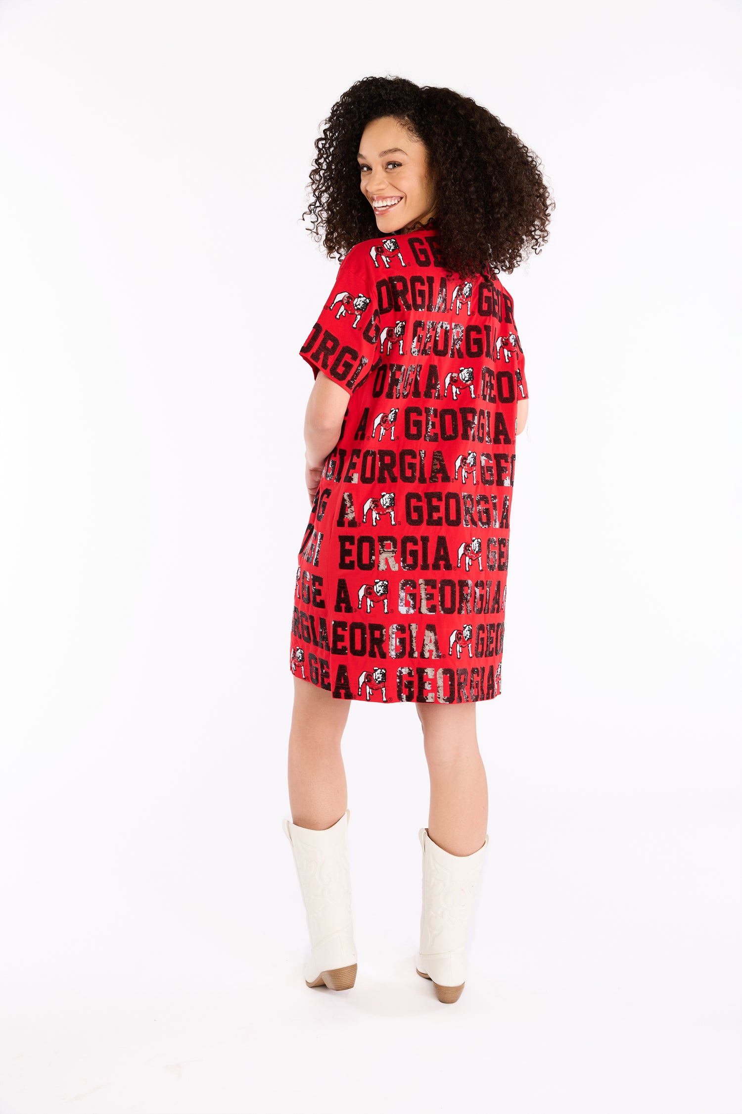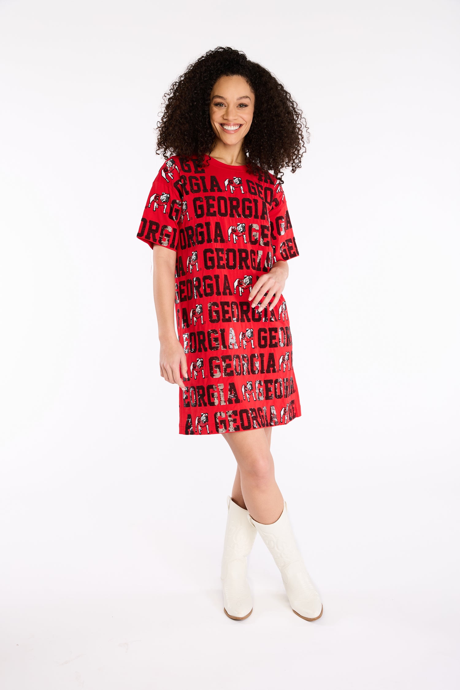 This t-shirt dress does the most in all the right ways—featuring repeating sequin logos and wordmarks across the front and back. Cut in a relaxed silhouette that’s easy to throw on and go, it brings major impact with minimal effort. Style it with chunky bracelets and statement boots for a complete look.