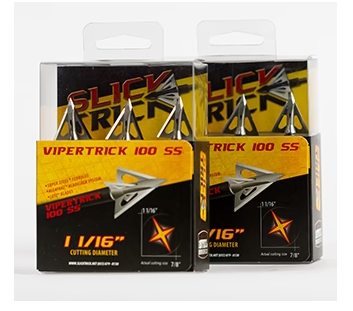 The new for 2017 SlickTrick Pro Series ViperTrick uses an all stainless steel construction. These broadheads penetrate further and do more damage than ever before. Best yet, because they resist corrosion, you never have to worry about having a sharp edge.