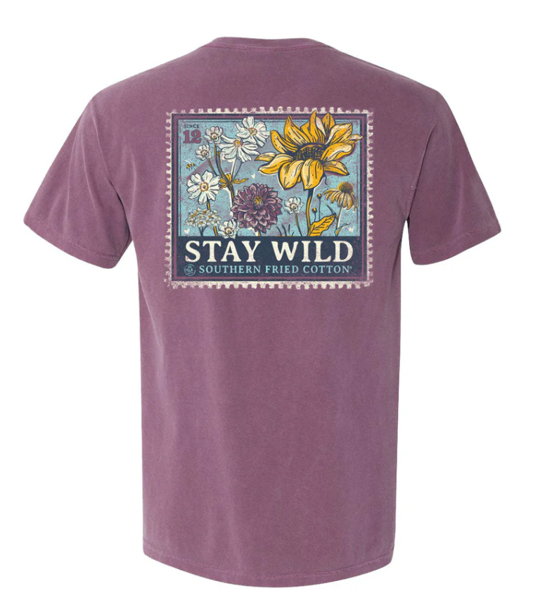 A little wild and a whole lot Southern. The Stay Wild tee blooms with vibrant wildflowers and bold text, set in a vintage-style stamp design. It’s soft, eye-catching, and perfect for those who feel most at home outside.