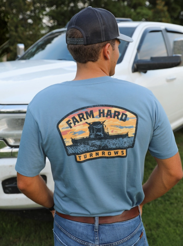 A tribute to early mornings and long hours in the field, this pocket tee features a combine cutting through rows at dawn with “Farm Hard” stamped across the back. 100% cotton Relaxed fit Tag free Built for those who get after it—sunup to sundown.