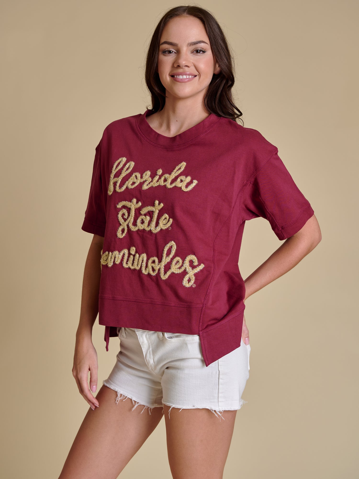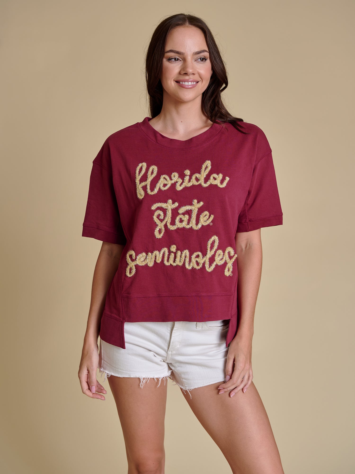 The Glitter Script Boxy Top - Florida State combines casual comfort with spirited style. Featuring a relaxed boxy fit and shimmering script detailing, this top offers a flattering silhouette while showcasing your Florida State pride. Crafted for everyday wear, it pairs effortlessly with jeans or shorts, making it a versatile addition to your wardrobe. Perfect for game days or casual outings, it delivers both comfort and a standout look.