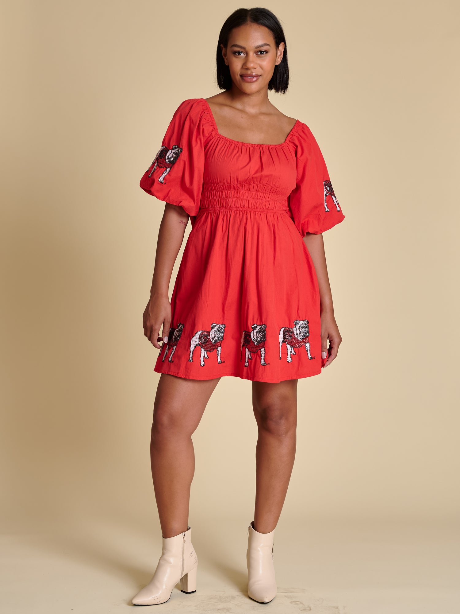 This puff sleeve mini dress features elastic smocking at the chest, a flattering A-line shape, and sequined logo placements at the hem and sleeves. A functional tie at the back adds a sweet finishing touch. We love it styled with trendy sneakers for a flirty casual look, or with cowboy boots for a dash of Southern charm.