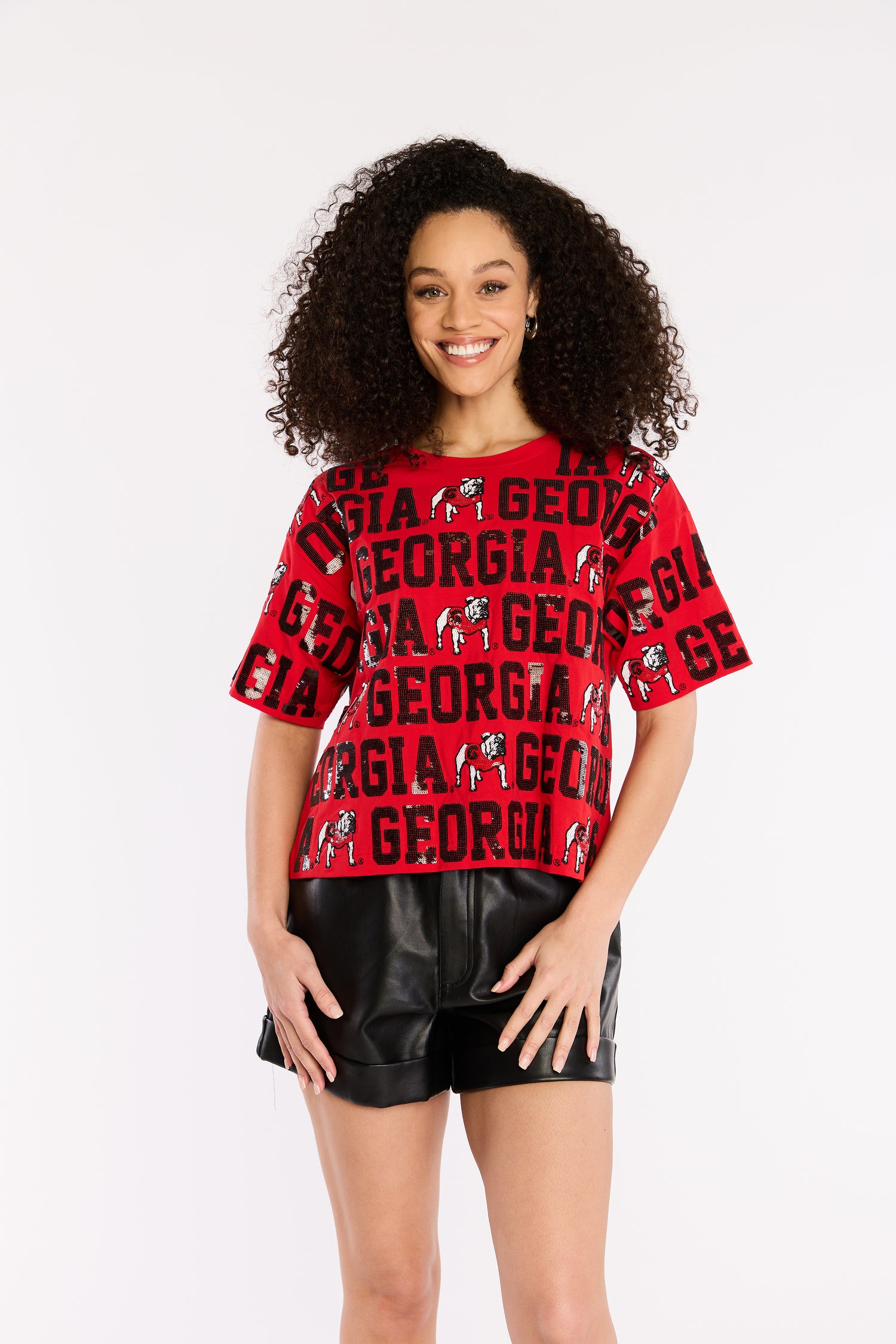 This short sleeve boxy tee takes team spirit to the next level, with a full repeat of sequin wordmarks and logos across the front and back. Cut in a relaxed silhouette, it’s the definition of cool-meets-chic. We’re styling it with a sequin mini and chunky bangles for added glam, or oversized with biker shorts and a crossbody bag for effortless edge.