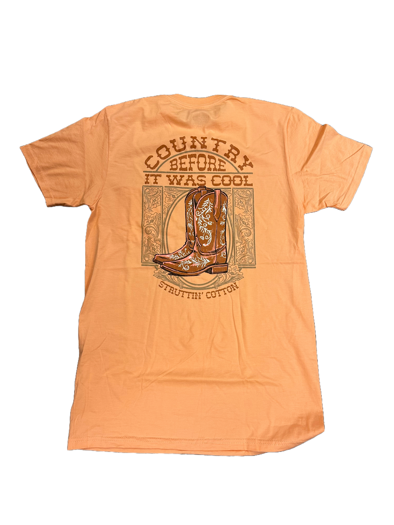 The When Country Wasn't Cool Tee in Mimosa Orange by Struttin Cotton offers a refined blend of comfort and style. Crafted from premium cotton, this tee ensures breathability and durability, making it ideal for everyday wear. Its subtle grey hue provides versatile pairing options, while the expert tailoring guarantees a flattering fit. Perfect for those seeking a sophisticated yet casual look, this tee combines quality materials with thoughtful design for lasting comfort and effortless style.